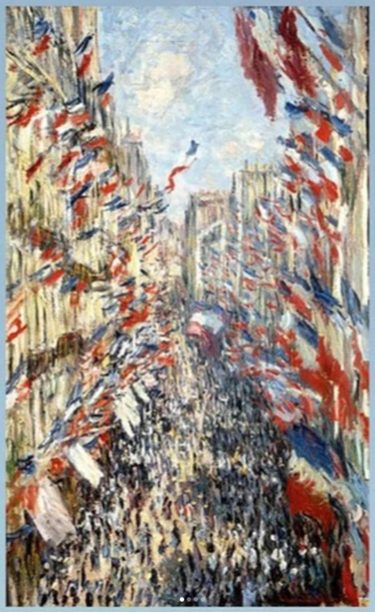 The painting is 'Rue Montorgueil, Paris, Festival of 30 June 1878' by Claude Monet.